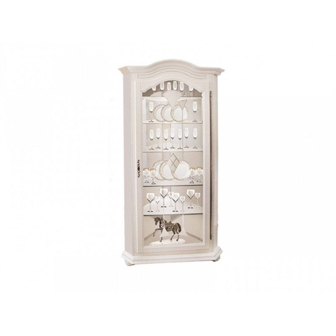 Угловой шкаф с витриной из коллекции мебели для жилой комнаты "Давиль" ( угол 725х725 мм). Модель изготовлена с использованием массива дуба в прекрасном классическом стиле с легким оттенком Прованса, декорирована гнутым карнизом и скромным витражом на стекле. Витрина оснащена встроенной подсветкой. Модель окрашена в цвет "Белая эмаль"