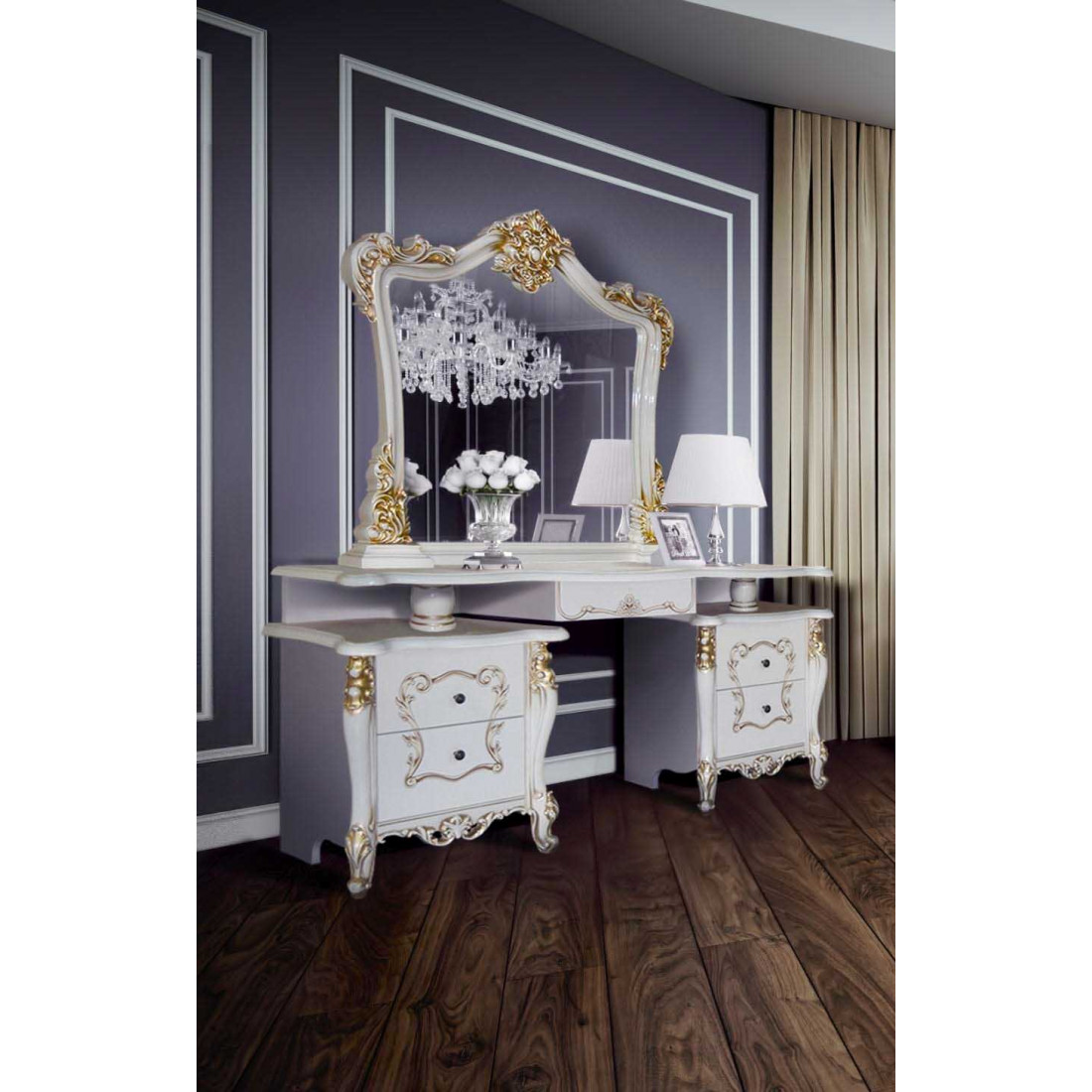Туалетный столик с зеркалом Джоконда (слоновая кость) от Российской фабрики «ДИА мебель» выполнена в белом цвете. Ручки цвета позолоты и глянцевое покрытие придадут богатую атмосферу в спальне.Вместительный столик комплектуется зеркалом. Столик выполнен в стиле бароккко, подчеркнет чувства стиля своего владельца.