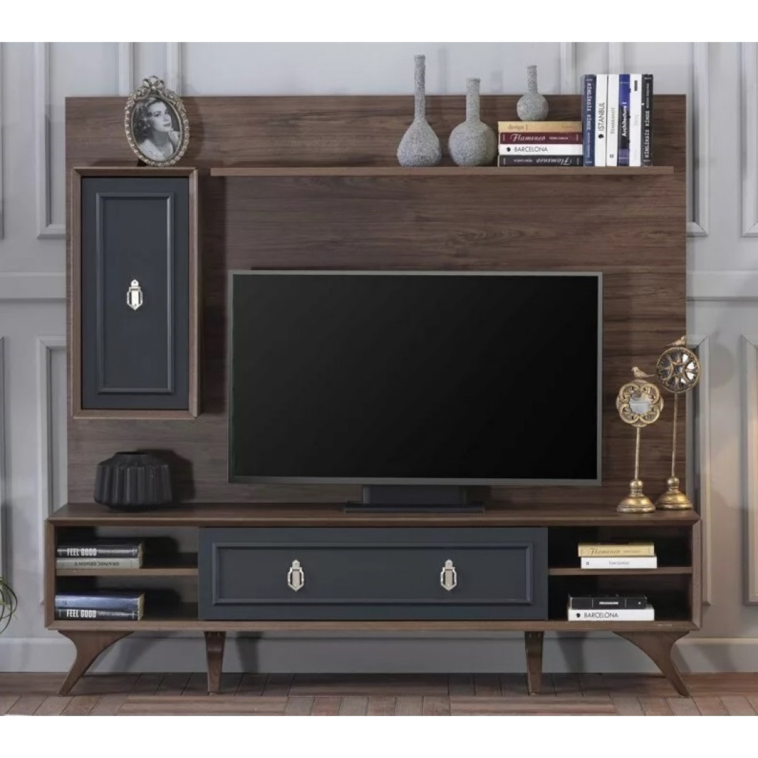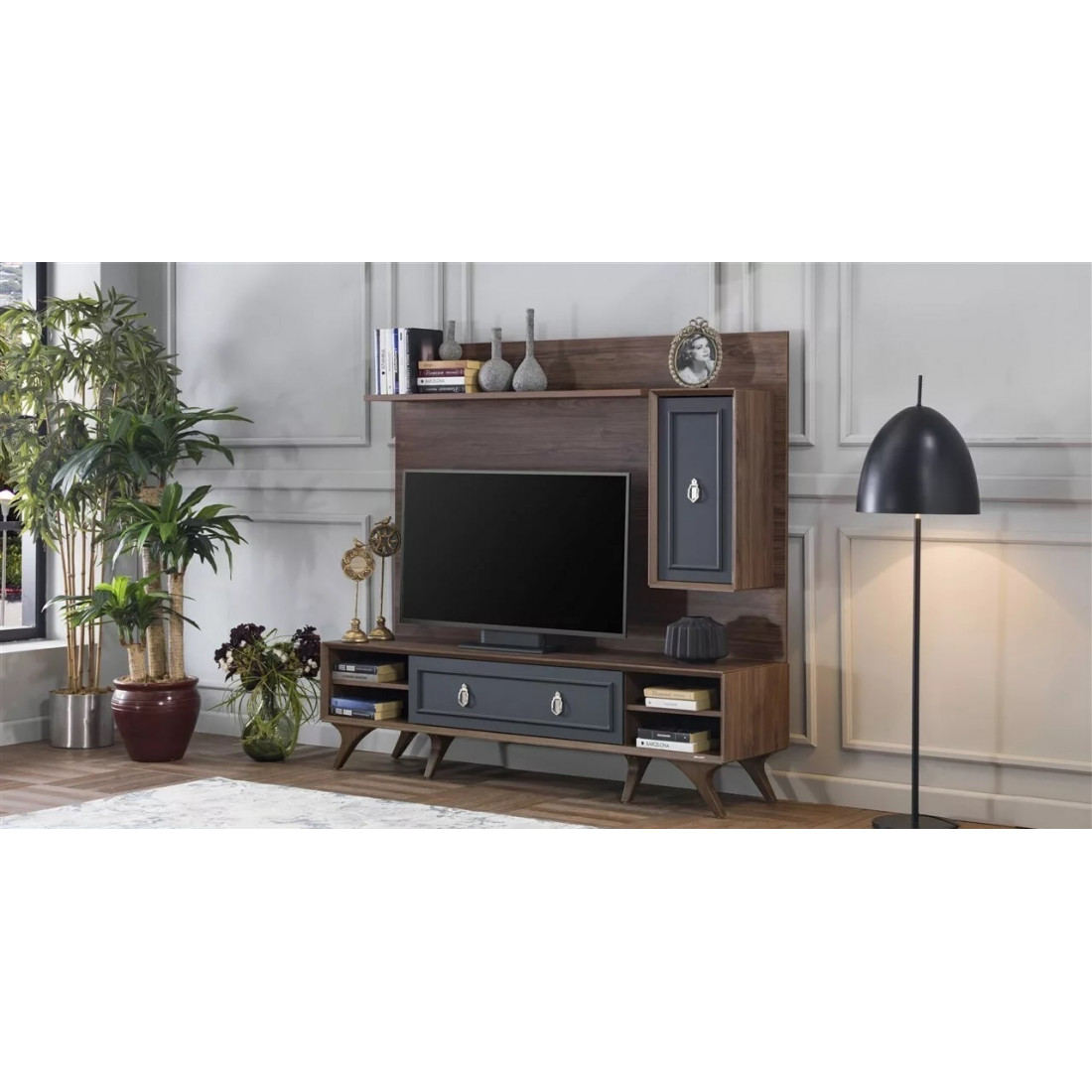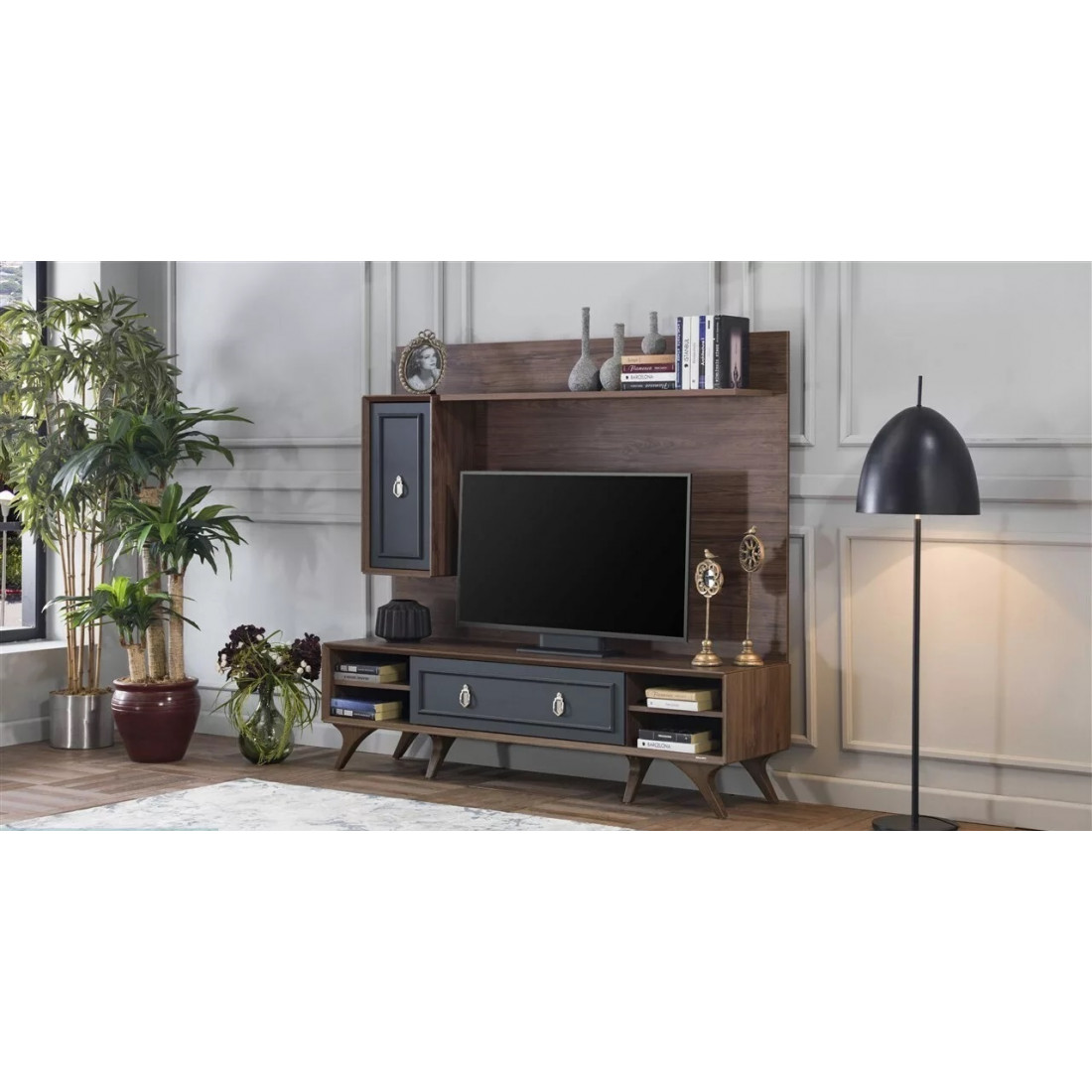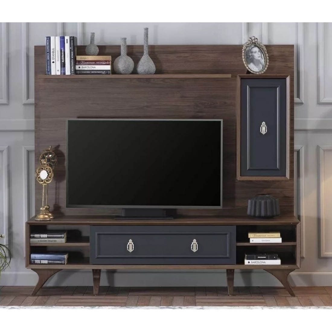 Тумба под ТВ в гостиную серии Алегро от Беллона станет прекрасным, многофункциональным дополнением интерьера гостиной. Ручки образуют единый декоративный элемент, сходясь в центре фасадов. В качестве материала для фасадов, столешницы и ножек использовался МДФ.